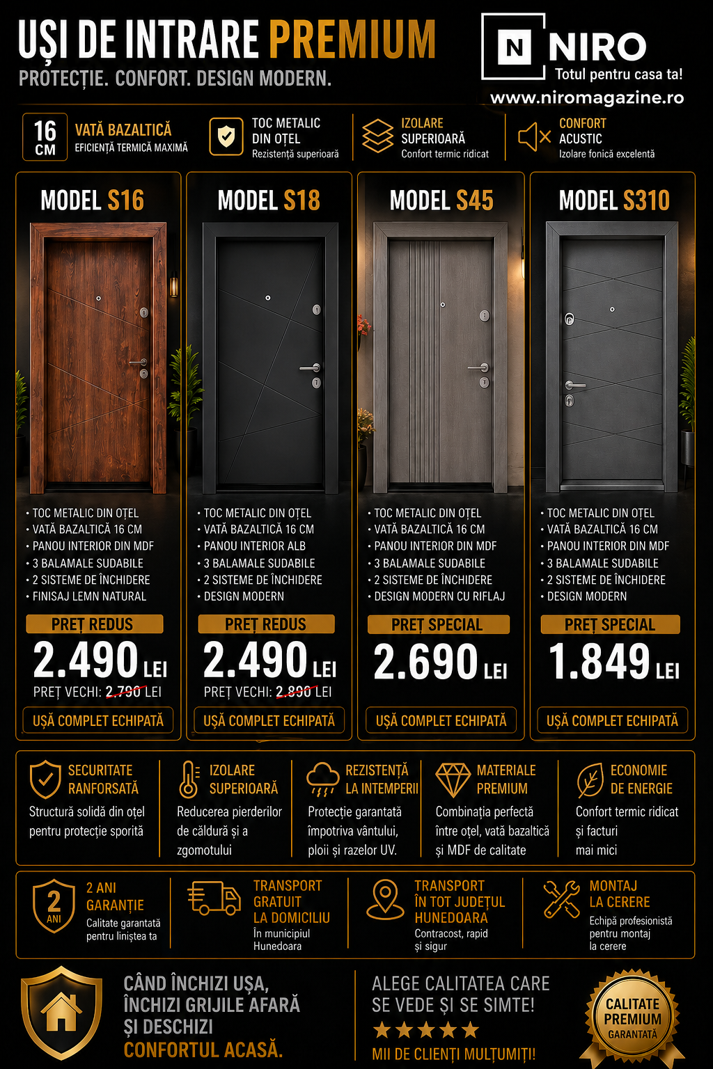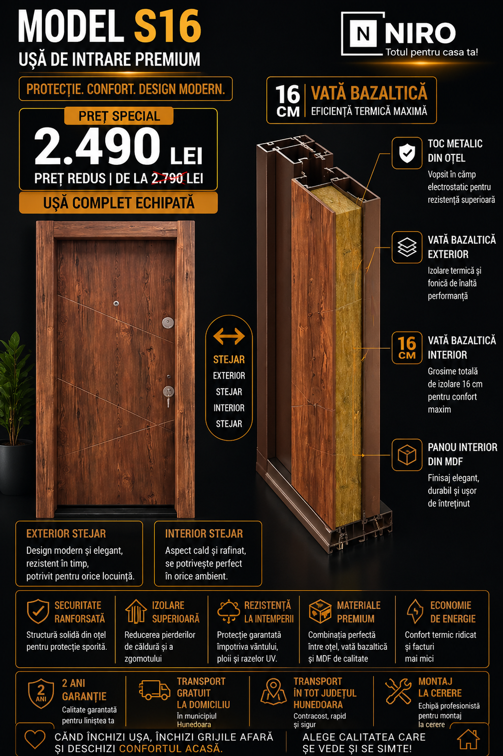 Pentru un apartament elegant și bine protejat, vă prezentăm noul model exclusiv de ușă de intrare din gama premium, cu toc îmbrăcat. Această ușă combină perfect designul modern cu funcționalitatea avansată. Cu dimensiuni standard de 85x202 cm, este dedicată apartamentelor și se integrează perfect în orice spațiu modern. Inserțiile rafinate din PVC imitație lemn adaugă un plus de stil, în timp ce izolația termică și fonică, realizată cu vată bazaltică de 25 cm, oferă un confort excepțional, reducând zgomotul exterior și menținând temperatura optimă.
